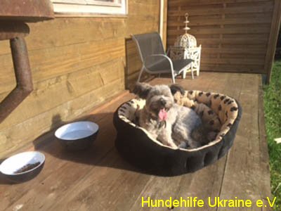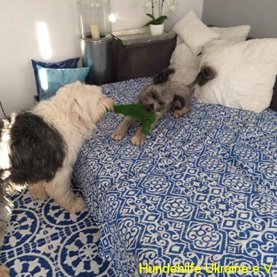 Bony ist eine fröhliche und noch dazu ganz zutrauliche Zottel-Mix-Hündin. Das Hundemädchen hatte den denkbar schlechtesten Start ins Leben. Die Tierschützer fanden sie als hilfloses Hundebaby in einem erbärmlichen Zustand an einer Straßenecke in Chmelnitzky – halb verhungert, das hübsche Zottelfell verfilzt und dem Verdursten nahe. Sie nahmen das verwaiste Hundekind in ihre Obhut und päppelten es auf.
