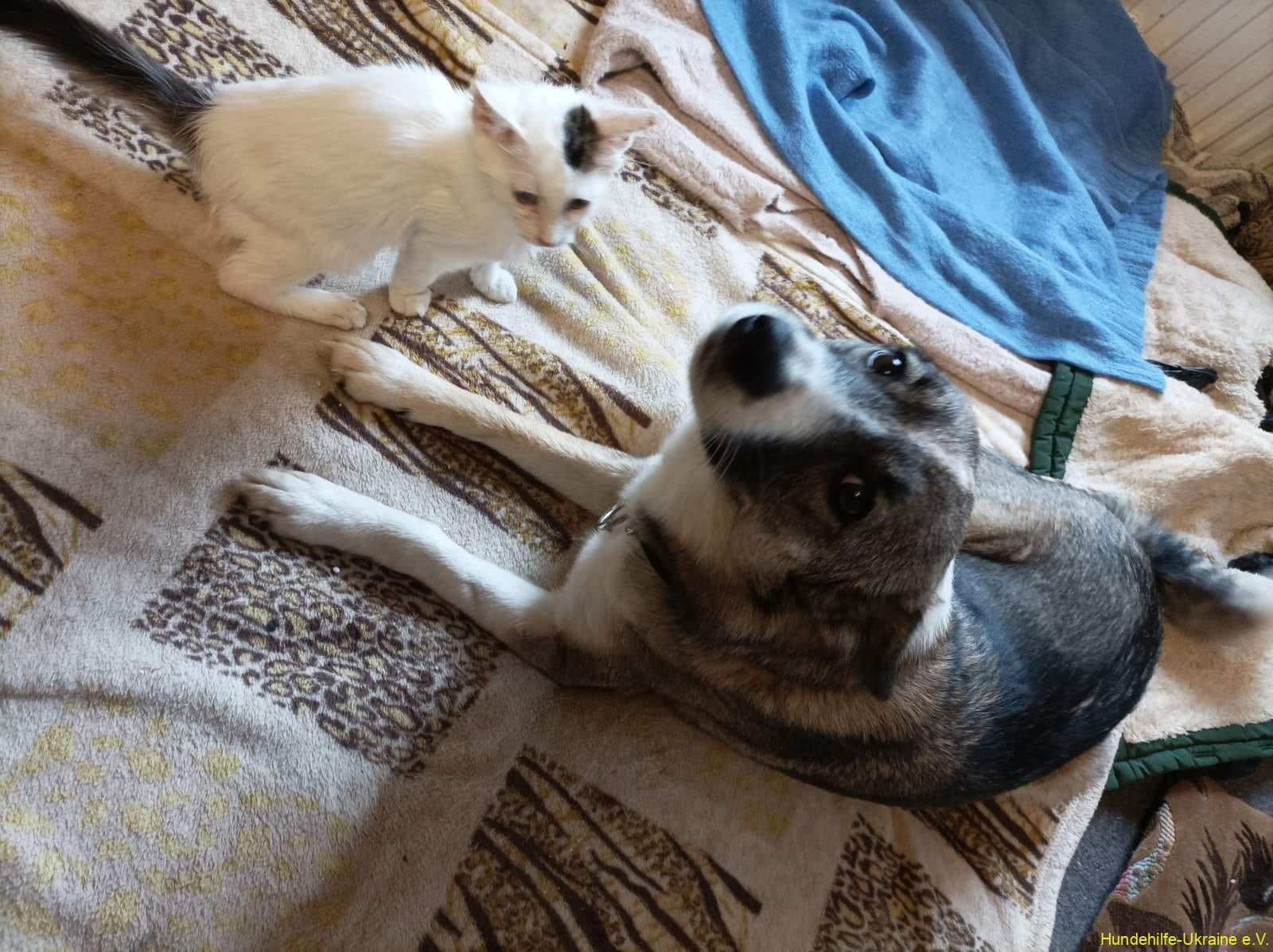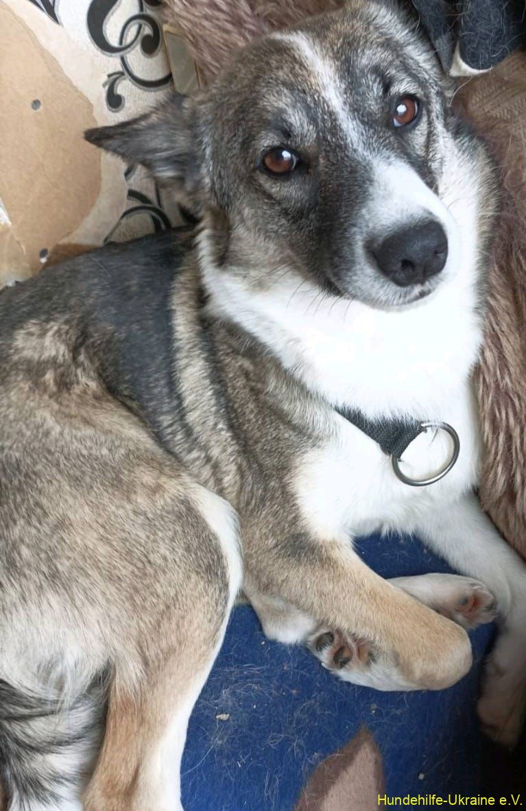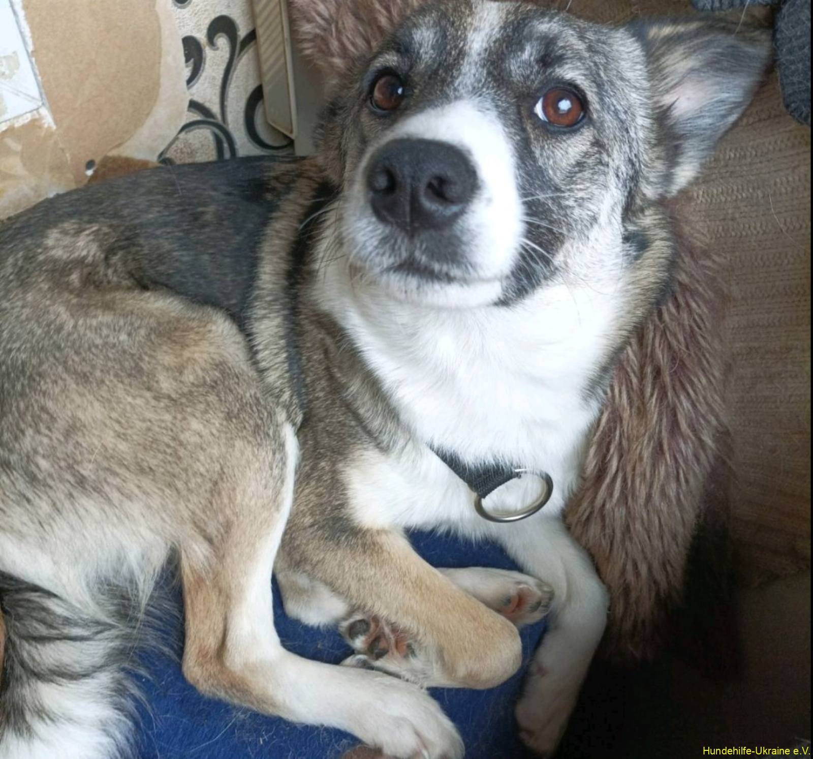 Sie war nie ein Straßenhund, hat nie Gewalt von Menschen erlebt, ihre Besitzer verließen die Ukraine ohne sie und sie wurde von ihren Rettern aus dem Dorf abgeholt.