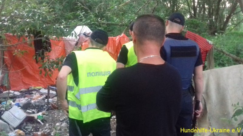 Sie verhielten sich sowohl gegenüber dem Hund als auch gegenüber den Freiwilligen aggressiv. Sie versuchten uns zu vertreiben mit der Begründung, es wäre ein Privatgrundstück. Aber es ist kein Privatgrundstück sondern städtisches Territorium. Die Anwohner schrien, halfen nicht den Freiwilligen und behinderten die Hilfeleistung. Lena wiederholte ständig: „Wir werden jetzt erste Hilfe leisten und bringen den Hund weg. Wir nehmen ihn mit. Bitte, bitte, stört uns nicht! Wartet etwas!“