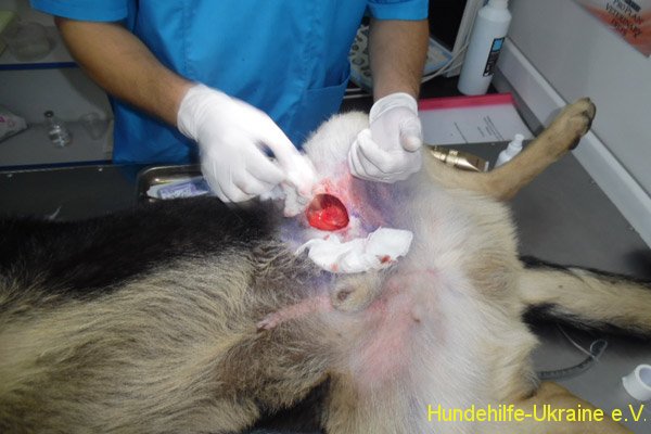 Der Wachmann konnte nun den verletzten Hund festhalten und ich konnte ihn so endlich untersuchen und helfen. Zum Glück hatte er keine Frakturen aber einige Platzwunden. Ich konnte ihm Injektionen verabreichen und die Wunden versorgen.